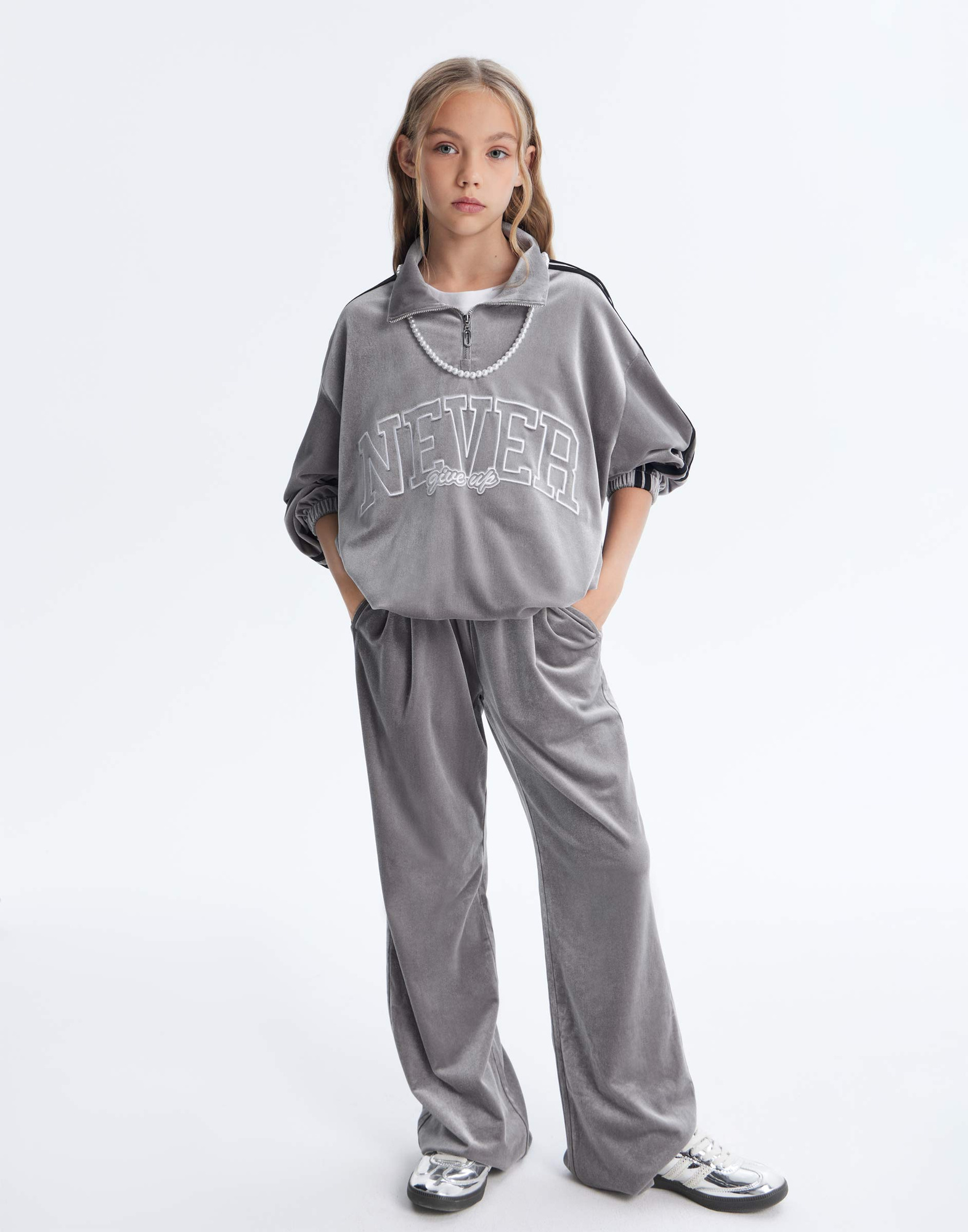 Серые спортивные брюки-трансформеры Wide leg из велюра GAC023957-1