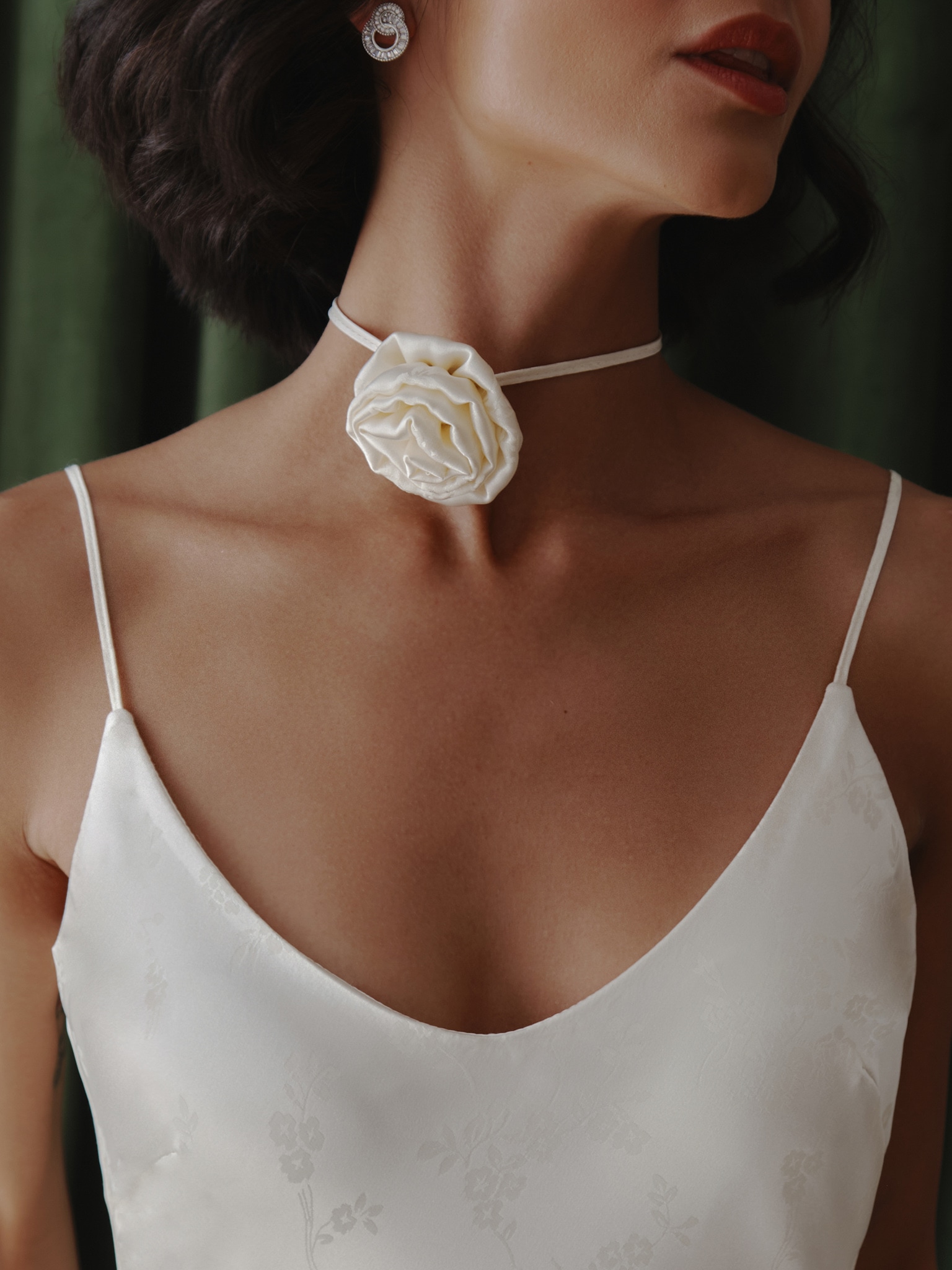 Атласное платье-комбинация макси с цветочным орнаментом и чокером
